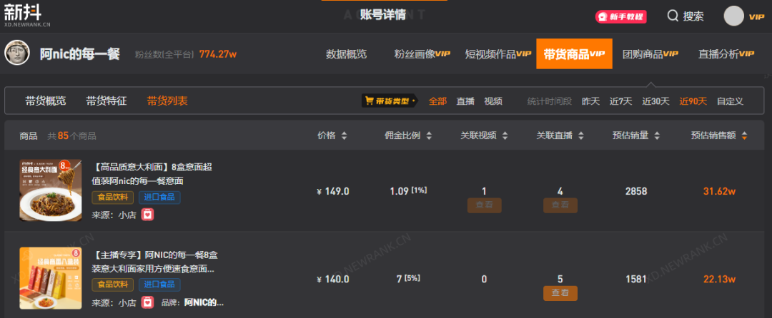 相似的,美食博主“阿nic的每一餐”通過(guò)美食教程視頻積累了超過(guò)774萬(wàn)粉絲,在阿nic的視頻中,西餐的出鏡率極高,披薩、意面和薯?xiàng)l等經(jīng)典菜品的教程廣受歡迎,因此他以意面為切入口,創(chuàng)立了自己的西餐品牌。新抖數(shù)據(jù)顯示,該賬號(hào)帶貨的兩款個(gè)人品牌意面近三個(gè)月銷售額超50萬(wàn)元。