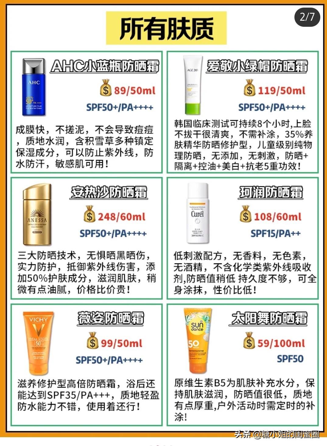 適合所有膚質(zhì)的這6款防曬霜,小編主推3款,一是AHC家的小藍瓶,價格美麗而且使用感很nice~不油不悶,二是安耐曬,不知道選什么防曬安耐曬總是沒錯的,防曬能力超強,就是個別膚質(zhì)敏感的小仙女會悶痘哦,三是薇姿的防曬,法國藥妝成分安心。