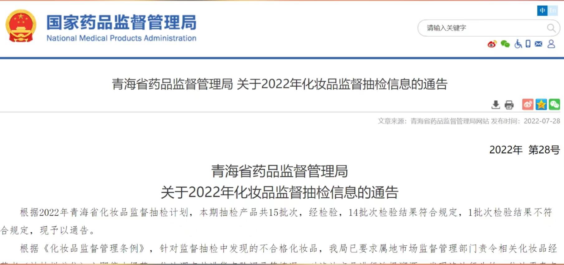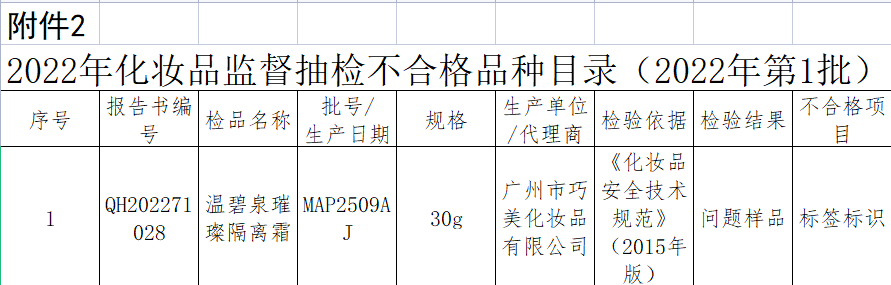根據(jù)2022年青海省化妝品監(jiān)督抽檢計(jì)劃,本期抽檢產(chǎn)品共15批次,經(jīng)檢驗(yàn),14批次檢驗(yàn)結(jié)果符合規(guī)定,1批次檢驗(yàn)結(jié)果不符合規(guī)定,為廣州市巧美化妝品有限公司生產(chǎn)的溫碧泉璀璨隔離霜,涉標(biāo)簽標(biāo)識(shí)項(xiàng)目不合格。