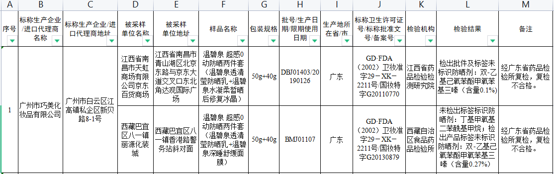 2016年,在食品藥品監(jiān)督管理總局在全國范圍組織開展的化妝品監(jiān)督抽檢中,廣州市巧美化妝品有限公司生產(chǎn)的溫碧泉 超感0動(dòng)防曬兩件套(溫碧泉透清瑩防曬乳+溫碧泉水凝柔皙曬后修復(fù)冰晶)被檢出批件及標(biāo)簽未標(biāo)識(shí)防曬劑:雙-乙基己氧苯酚甲氧苯基三嗪(含量0.1%);溫碧泉 超感0動(dòng)防曬兩件套(溫碧泉透清瑩防曬乳+溫碧泉深睡舒緩面膜)未檢出標(biāo)簽標(biāo)識(shí)防曬劑:丁基甲氧基二苯?;淄椋粰z出產(chǎn)品標(biāo)簽未標(biāo)識(shí)防曬劑:雙-乙基己氧苯酚甲氧苯基三嗪(含量0.27%),兩款產(chǎn)品經(jīng)廣東省藥品檢驗(yàn)所復(fù)檢,均復(fù)檢不合格。