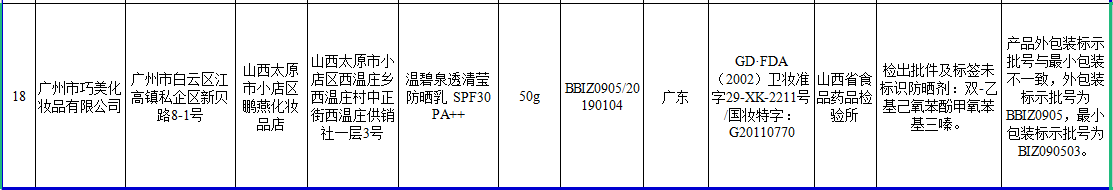2017年,廣州市巧美化妝品有限公司生產(chǎn)溫碧泉透清瑩防曬乳 SPF30 PA++經(jīng)山西省食品藥品檢驗(yàn)所檢驗(yàn),檢出批件及標(biāo)簽未標(biāo)識(shí)防曬劑:雙-乙基己氧苯酚甲氧苯基三嗪;產(chǎn)品外包裝標(biāo)示批號(hào)與小包裝不一致,外包裝標(biāo)示批號(hào)為BBIZ0905,小包裝標(biāo)示批號(hào)為BIZ090503