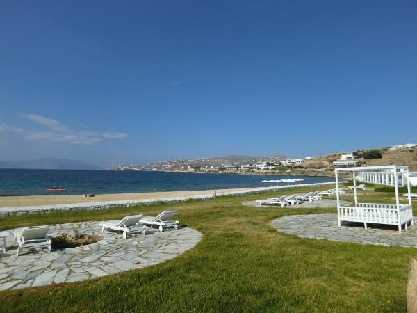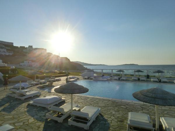 米島上的酒店” Mykonos Bay Hotel “是我連續(xù)待了2晚的。這個(gè)酒店林總覺得很是滿意,因?yàn)榫频曜约簱碛幸黄饺松碁?,而且有個(gè)大泳池。價(jià)錢也是靠譜,兩晚頂人家圣島一晚住宿啊。距離downtown就幾分鐘路程,鬧中取靜,林總晨跑的時(shí)候沿著山路上去,說這家是沿途那么多家中好的。