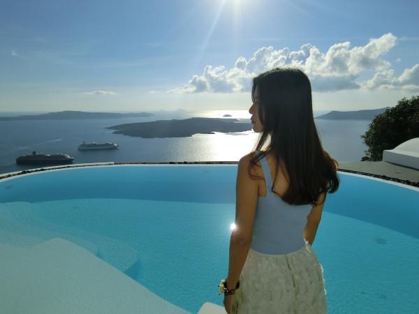 逛了下實(shí)在太曬了,我們就回酒店了。林總?cè)ゾ频甑臒o邊泳池放松了下。酒店的泳池雖然小,不過卻是這幾家酒店中美的。