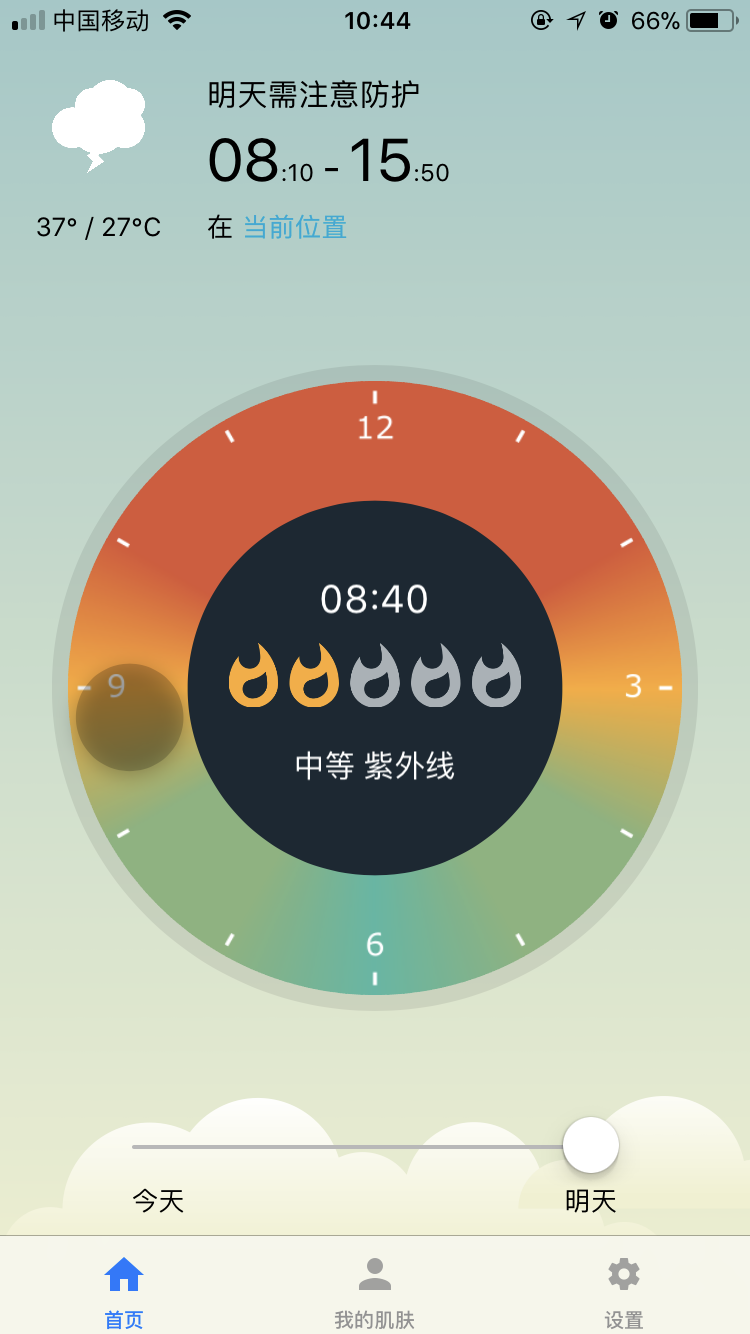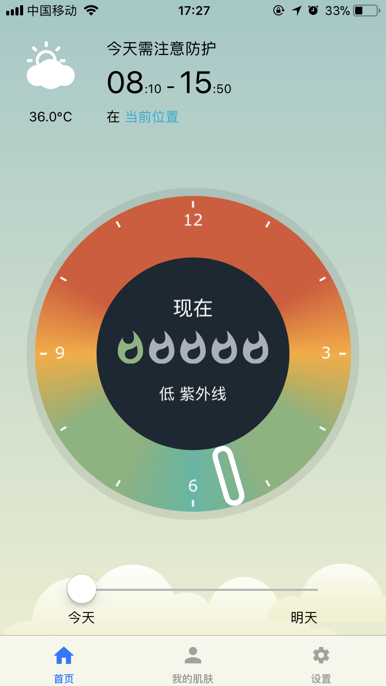 貼心的紫外線防護(hù)提示確定好位置之后,應(yīng)用就會(huì)給出當(dāng)天的天氣、溫度、即時(shí)紫外線,并給出需注意防護(hù)的時(shí)間段。