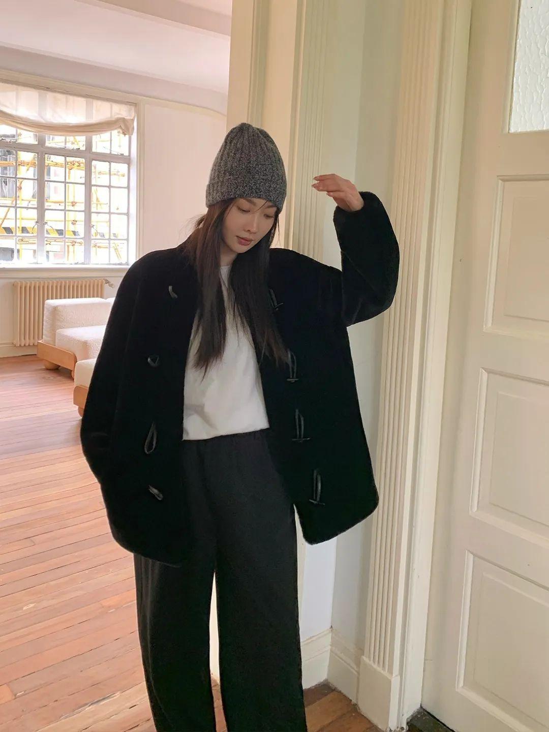 落肩袖的廓形上身還蠻有氣場的,里面搭一身黑色羊毛衫羊毛褲就可以通勤了。