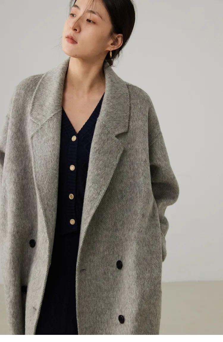 JUM這件簡約的花灰色大衣,綿羊毛面料軟糯,而且很好打理,不容易皺。