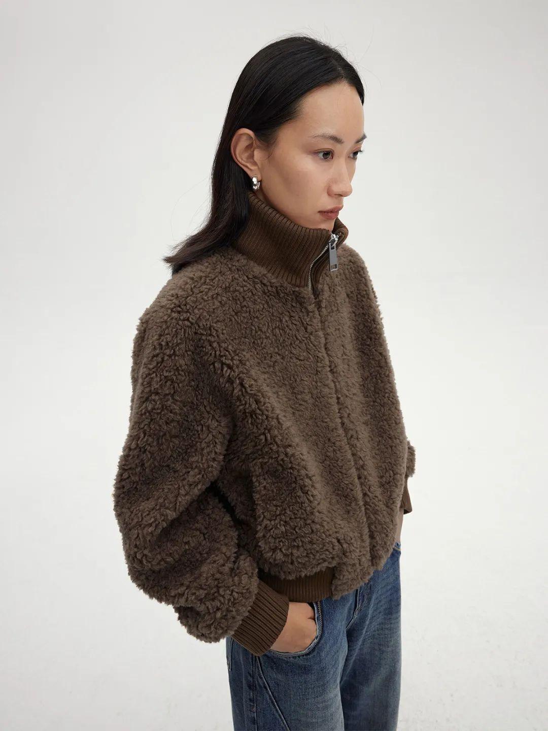 RandomPiece2022這款全羊毛麂皮絨的短款?yuàn)A克,有點(diǎn)像棒球服的款式,上身蠻減齡的。