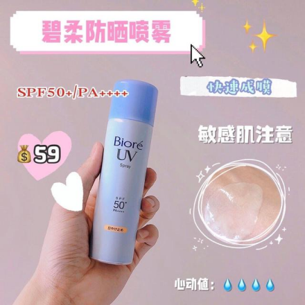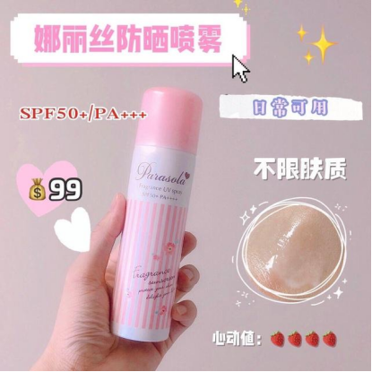 這款防曬噴霧噴出來(lái)的是水珠狀,離近了噴清涼感超。瓶子是粉色的,顏值很可,滿足芭比少女心。味道香但是不刺激。防曬值為SPF50+PA+++,日常用夠了,就是它的防水防汗表現(xiàn)比起其他幾支噴霧要稍微差一點(diǎn)。