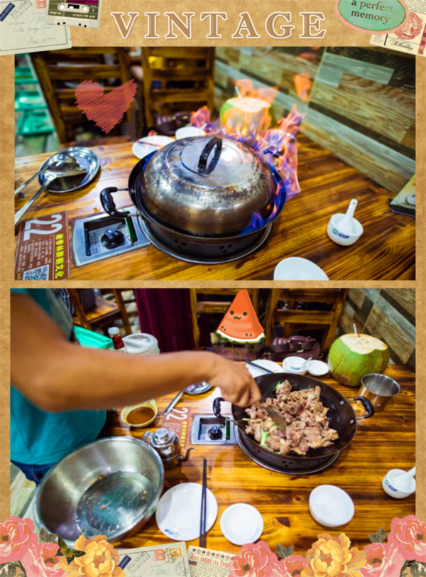 晚上,我們的晚餐是椰子雞,因?yàn)榍Ч徘槭侵形绮砰_園,所以我們?cè)缟掀鸬暮芡?,悠悠閑閑的更像是度假,也像是一個(gè)地道的海南人,不緊不慢,慢慢悠悠