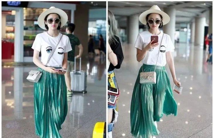 唐藝昕機(jī)場里草帽+白T+百褶裙的搭配,清新可愛,看著就很清爽▼