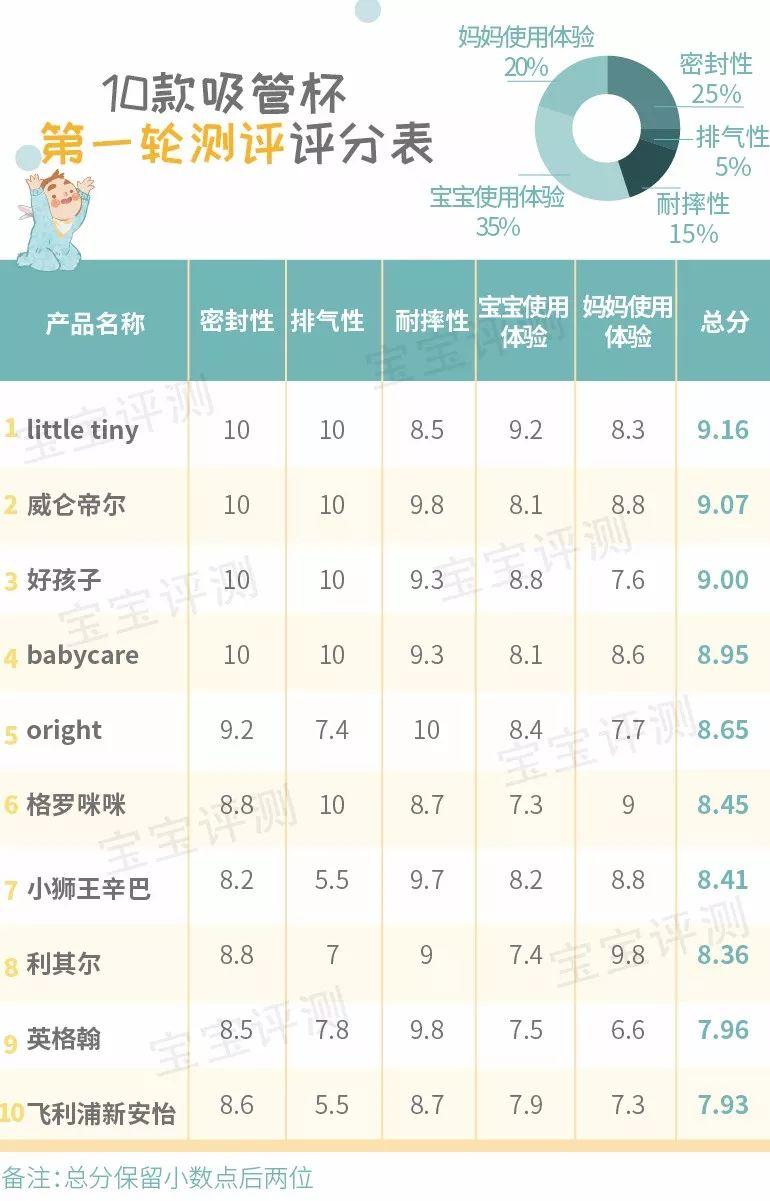 在密封性、排氣性、耐摔性、寶寶使用體驗、媽媽使用體驗等5項測評結束后,笨爸爸給不同的評測指標按重要程度進行權重劃分(具體權重見圖表),再經過加權平均計算,10款吸管杯第一輪測評的總分及排名情況如下: