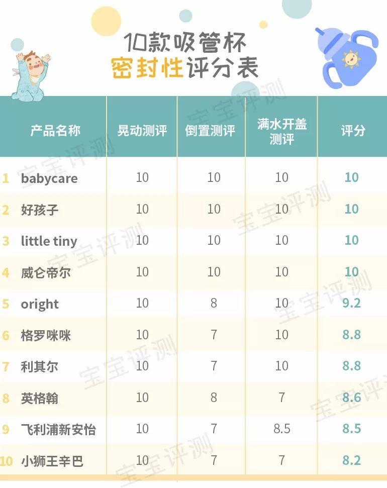 綜合3個項目的評測,10款吸管杯的寶寶使用體驗測評得分如下(滿分10分):