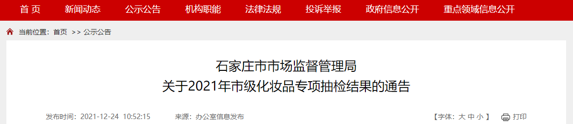 中國質(zhì)量新聞網(wǎng)訊 2021年12月24日,河北省石家莊市市場監(jiān)督管理局網(wǎng)站發(fā)布關(guān)于2021年市級化妝品專項抽檢結(jié)果的通告。