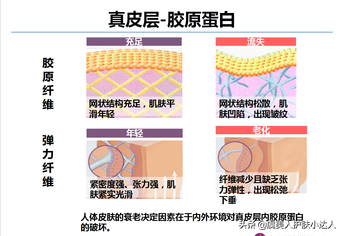 人體皮膚的衰老決定因素在于內(nèi)外環(huán)境對(duì)層內(nèi)膠原蛋白的破壞。隨著時(shí)間的流失,皮膚膠原蛋白會(huì)慢慢的流失,肌膚會(huì)出現(xiàn)凹陷,出現(xiàn)皺紋,出現(xiàn)松弛下垂。