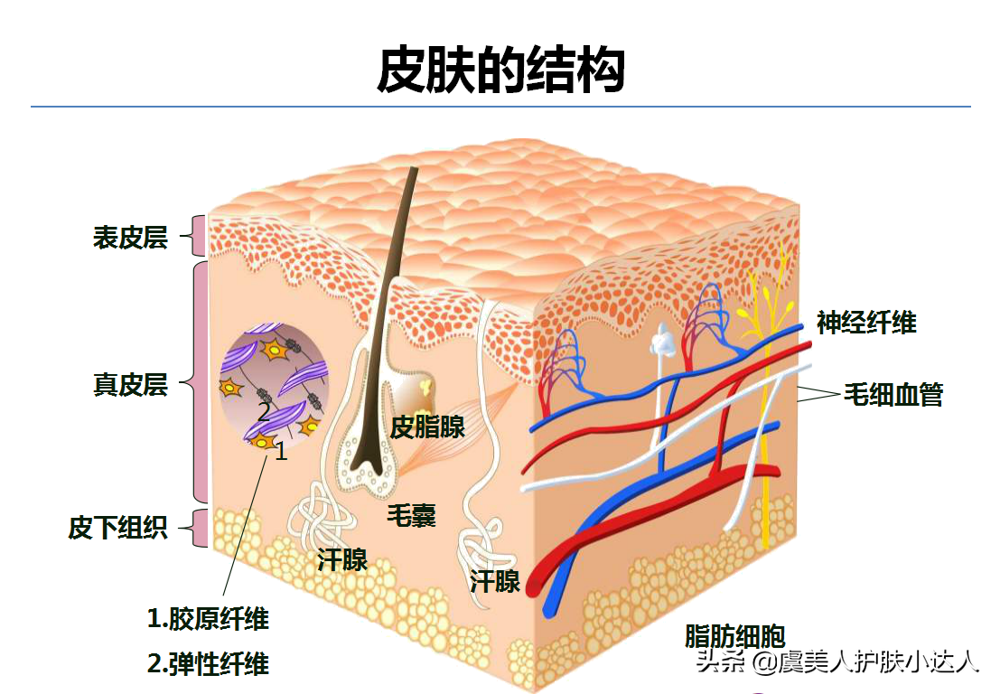 層好比一個(gè)席夢(mèng)思床一樣,支撐著我們的皮膚。由網(wǎng)狀纖維、膠原纖維和彈力纖維組成。三種纖維可以使皮膚具有良好的彈性和柔韌性,如果三種纖維減少、變形或功能下降的話,皮膚的彈性、韌性就會(huì)下降,就容易產(chǎn)生皺紋,這時(shí)就需要補(bǔ)充膠原蛋白。