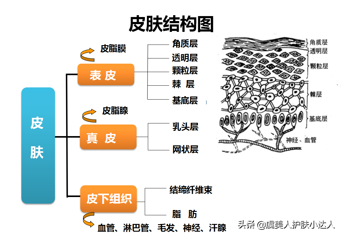 皮膚根據(jù)不同的部位,厚度從0.5mm-4mm,雖然皮膚的薄,但是根據(jù)細(xì)胞的不同發(fā)展階段和形態(tài)特點(diǎn),由外而內(nèi)分為三層:表皮層、層、皮下組織。