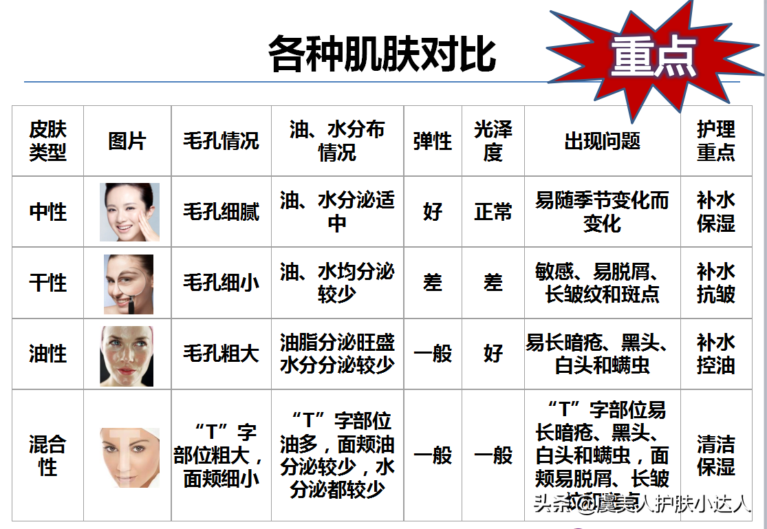 1、中性皮膚:是健康理想的皮膚,膚色紅潤(rùn)、細(xì)膩而富有彈性,厚薄適中,毛孔小,皮脂分泌量適中,皮膚既不干也不油,對(duì)外界刺激不敏感。但皮膚易隨季節(jié)變化,冬天稍干夏天稍油,多見(jiàn)于青春發(fā)育前少女,PH值5--5. 6 。