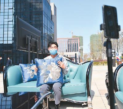 在江西省贛州市南康區(qū)跨境電商產(chǎn)業(yè)園,銷售員工通過手機(jī)直播的形式推銷家具。 新華社記者 胡晨歡攝