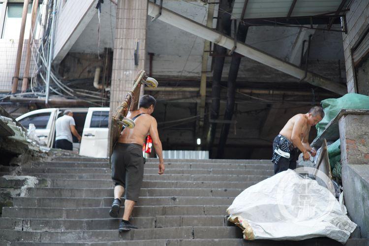 冉光輝需要把貨物送到附近居民樓里。朝天門老小區(qū)多,遇上沒電梯的,冉光輝就扛著一百五六十斤的貨一層層爬上去。一口氣走攏后,他掏出水壺猛地往嘴里灌,十來秒就底朝天。他說,夏日里一天大概要灌下差不多二十斤白開水。每天粗略算下來,平均得負重爬100多層樓。
