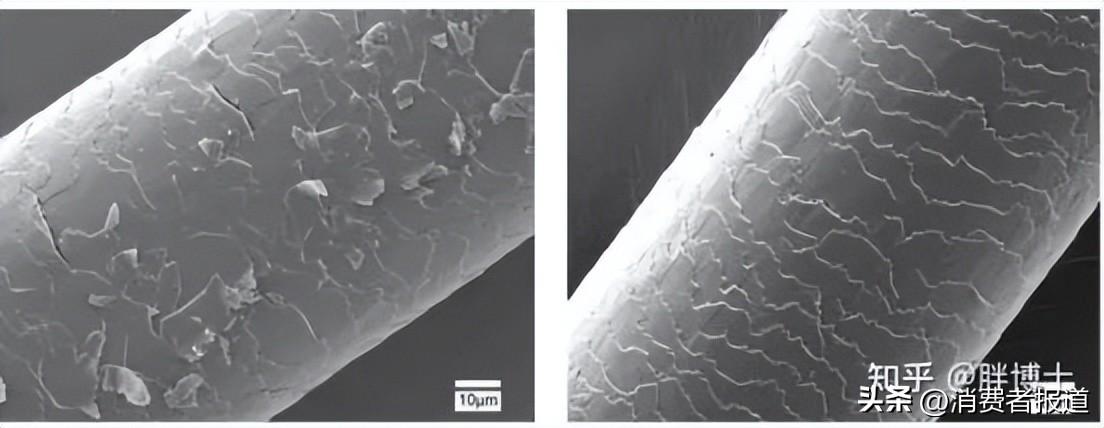 ▲紫外線下受損的毛鱗片(左)和正常的頭發(fā)對比(右)