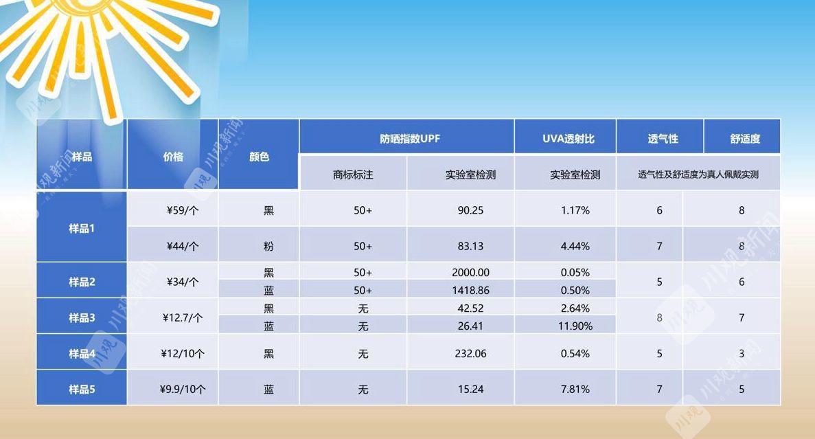 本次檢測(cè)樣品中,除了無明確標(biāo)注防曬指數(shù)的樣品3藍(lán)色口罩和普通醫(yī)用外科藍(lán)色口罩達(dá)不到推薦標(biāo)準(zhǔn)外,其他樣品均達(dá)到該要求。