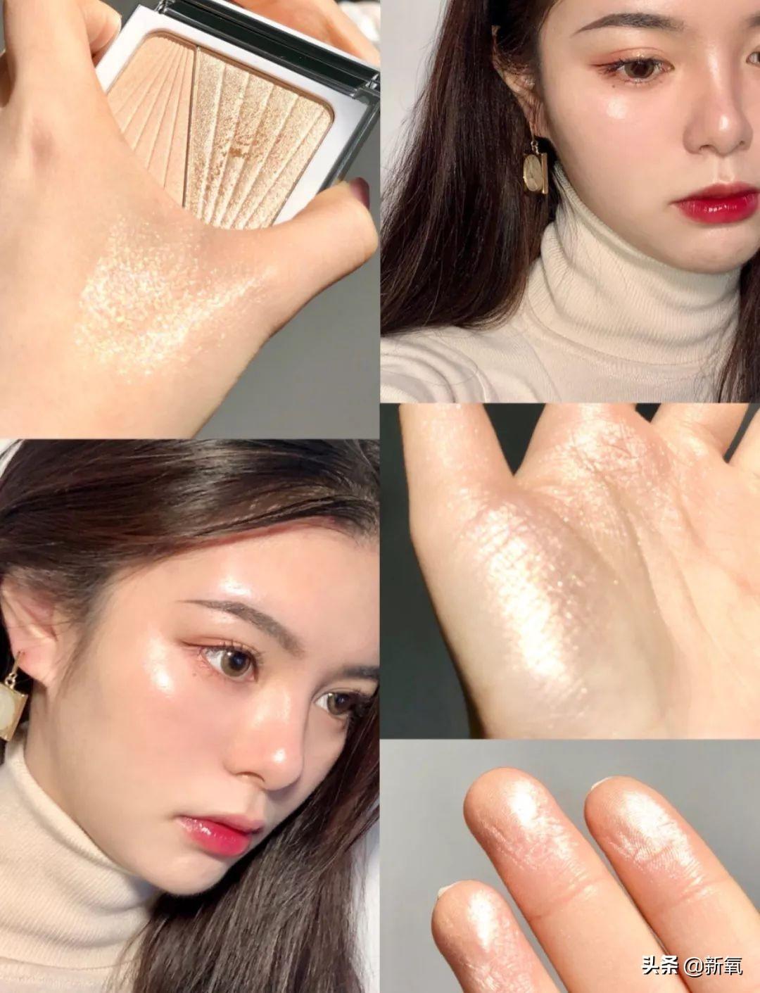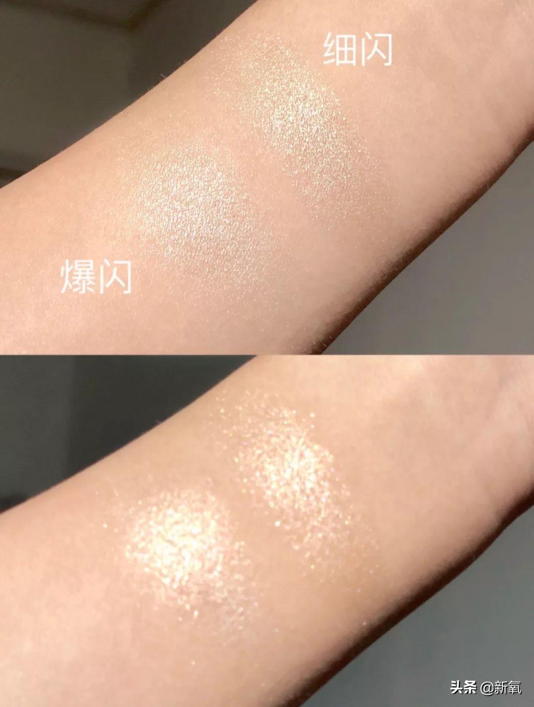 爆閃一側(cè)是淺香檳金色,用來(lái)起到提亮重點(diǎn)的作用??梢杂迷陲E骨、鼻尖、眼眶、眉骨、鎖骨、肩頭等想要凸顯性感的部位。它的效果是銀河般的閃亮感,是真的“爆”開(kāi)般的“亮”。