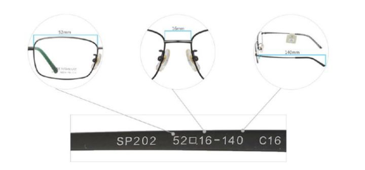示例圖-鏡框的參數(shù): 52口16-140 ,就表示鏡框?qū)挸叽缡?2mm,鼻梁尺寸16mm,鏡腿尺寸140mm 。
