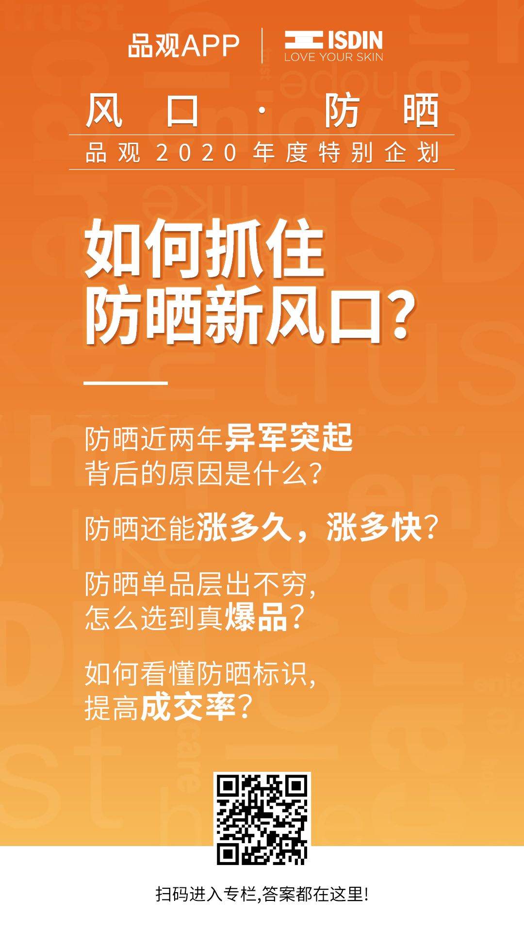 2020年,品觀APP聯(lián)合西班牙領(lǐng)先的護(hù)膚品牌怡思丁,開創(chuàng)專題欄目【風(fēng)口·防曬】,探索風(fēng)口中防曬品類的領(lǐng)漲之路。關(guān)于防曬新風(fēng)口的更多趨勢和知識,請從下圖掃碼進(jìn)入專欄閱讀↓
