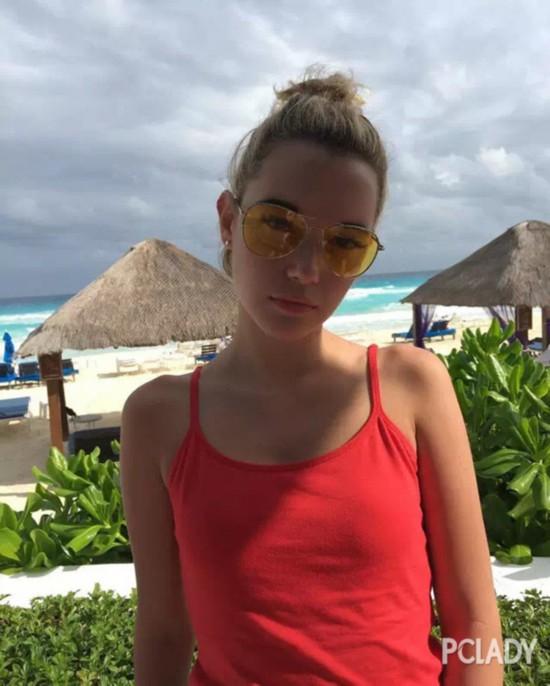 ins網(wǎng)紅Sarah Snyder去海邊游玩,戴的也是黃色大框眼鏡。