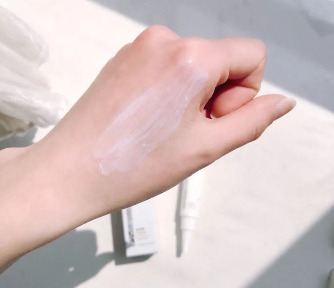 它的質(zhì)地有點像我們上學時用的涂改液,比較輕薄流動性高,涂抹上臉之后不會很顯白,成膜速度快,不過稍微有些油膩。防水性很好,沾上水立馬凝成水珠狀,易脫妝的寶寶放心用啦!