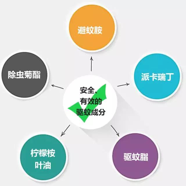 DEET(俗稱避蚊胺)、埃卡瑞?。ㄓ址Q派卡瑞丁)、伊默寧(又稱IR3535或驅(qū)蚊脂)、檸檬桉葉油、除蟲(chóng)菊酯。