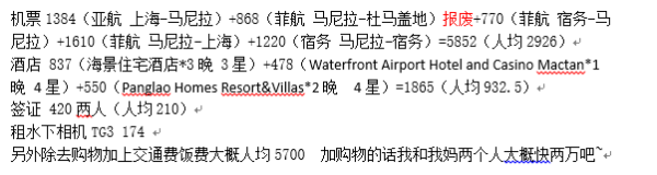 隨后到了馬尼拉機(jī)場T4,注意亞航降落T4。T3是宿務(wù)和菲律賓國內(nèi)航班-菲鷹,機(jī)場有免費(fèi)的航站樓轉(zhuǎn)換車,一定要持下程機(jī)票行程單才可以坐,是走機(jī)場內(nèi)部走的,不要傻傻去打馬尼拉的出租車,繞死你。媽媽還在馬尼拉T3買了個Victoria Secret 的包包,一千出頭一點(diǎn)點(diǎn) 插一句:宿務(wù)航空的空姐都很可愛,笑很甜,還會做小游戲,飛機(jī)上的冷氣太太太給力了~也很好玩~
