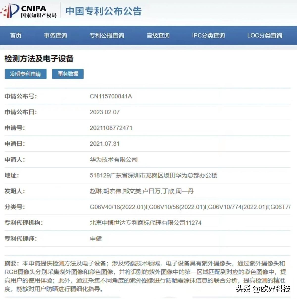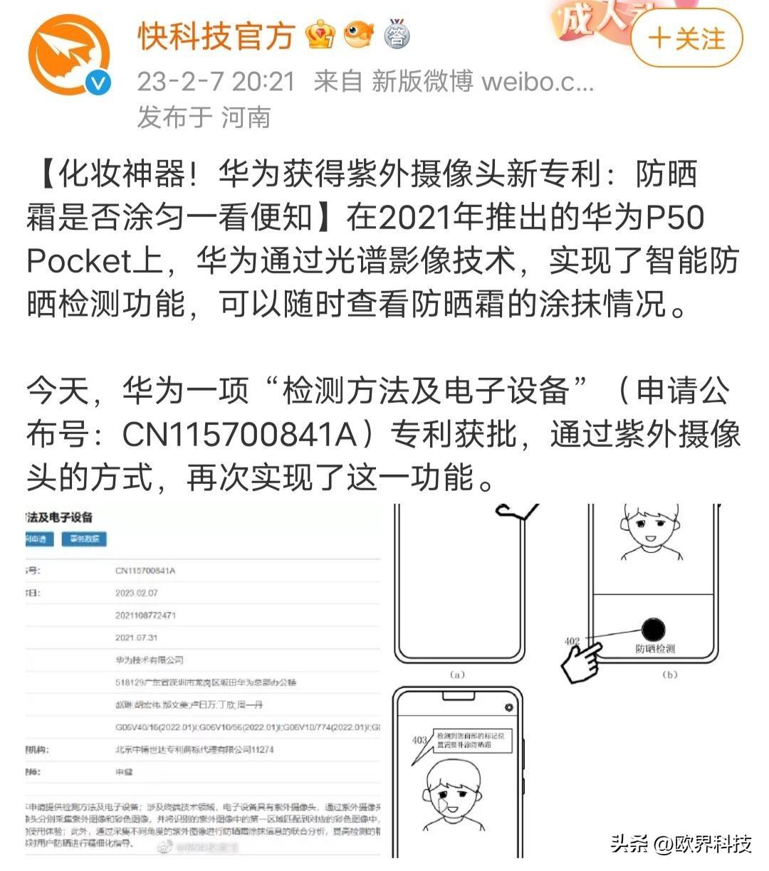 昨日,博主@快科技官方爆料“【化妝神器!華為獲得紫外攝像頭新專利:防曬霜是否涂勻一看便知】今天,華為一項“檢測方法及電子設(shè)備”(申請公布號:CN115700841A)專利獲批,通過紫外攝像頭的方式,再次實現(xiàn)了這一功能。”