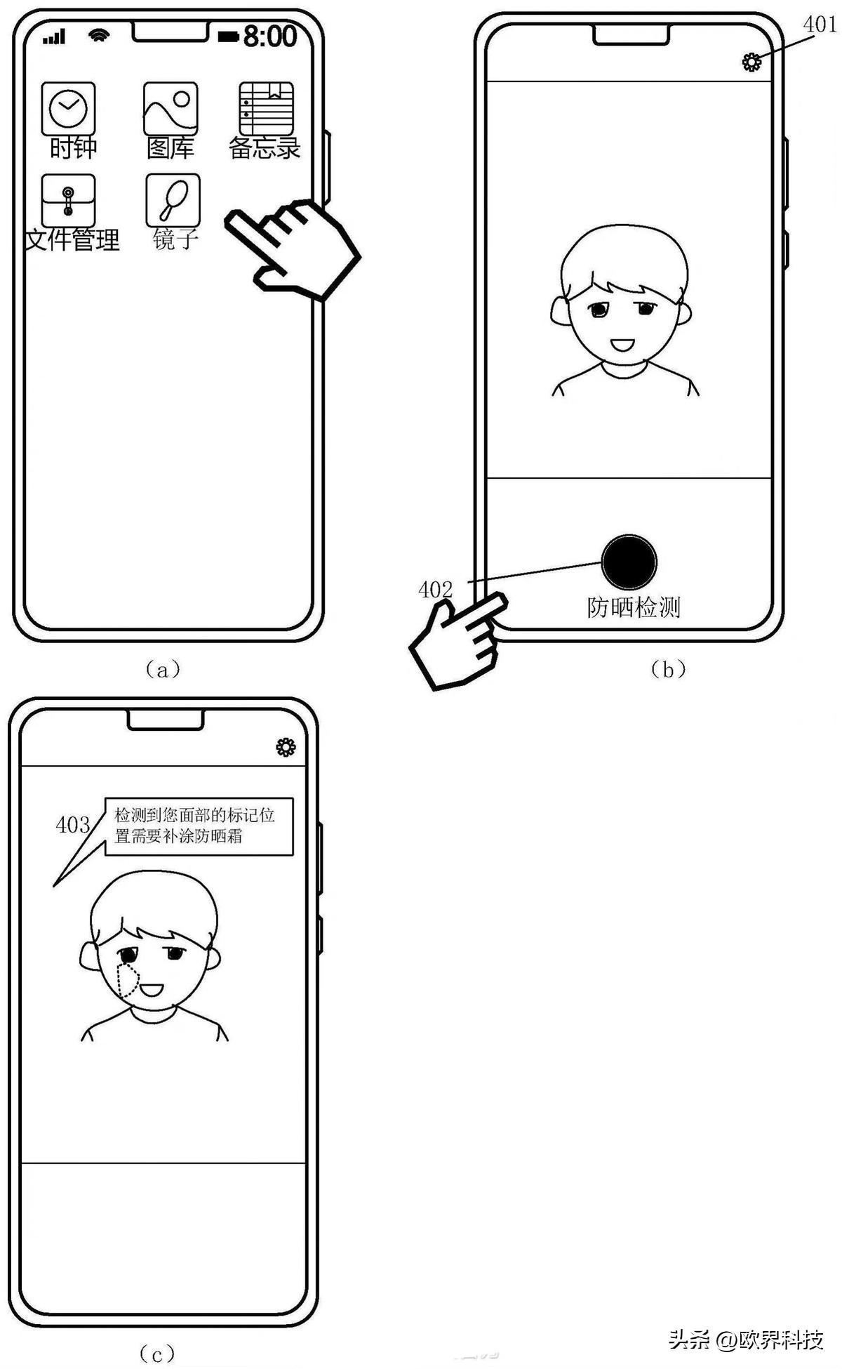 也就是說。華為的這項新專利可以通過紫外攝像頭和RGB攝像頭來采集紫外圖像以及彩色圖像,采集完畢匹配到相應(yīng)的彩色圖像中,以此來檢測用戶面部需要補涂防曬霜的區(qū)域,并且還能將該區(qū)域具體化。不僅如此,該項專利還可以提醒用戶注意防曬。