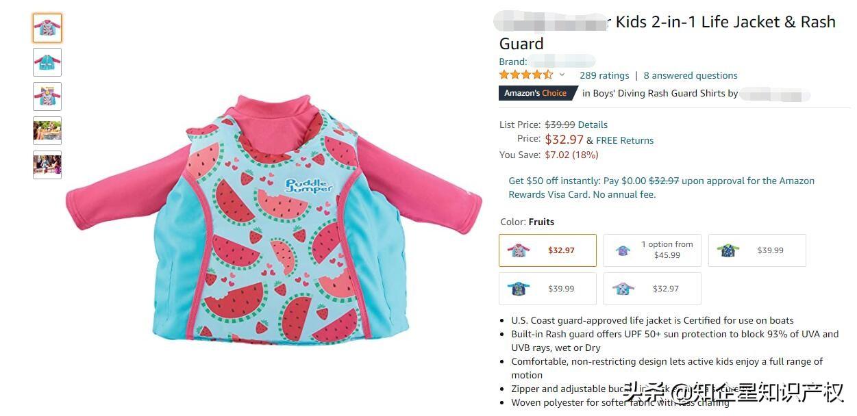 今天在瀏覽亞馬遜的時(shí)候,看到一款防曬救生兩用游泳衣,它是美亞站的Amazon'sChoicefor "puddle jumper 2 in 1 life jacket rash guard",售價(jià)32.97美金,留評(píng)292顆星。