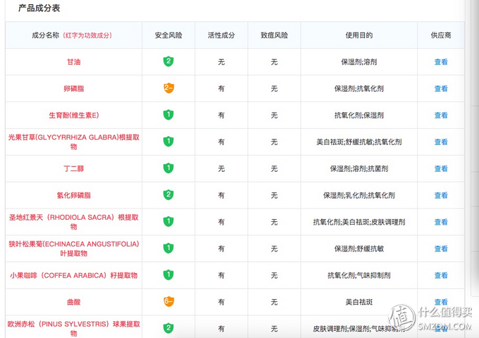 ▲可以看到主要成分。紅色的為功效成分,包括風(fēng)險(xiǎn)、致癌風(fēng)險(xiǎn)、使用目的等都可以看得到。里面就可以看到有光果甘草提取物的內(nèi)容,還有曲酸??梢婘扃孢€是挺貨真價(jià)實(shí)。但是悄聲嘀咕一句,如果光果甘草真的比曲酸值錢,為什么黛珂只宣傳自己添加曲酸,而不宣傳自己居然添加了這么黃金的光甘草定呢?而且搜遍全網(wǎng)都是力推一個(gè)什么雨的產(chǎn)品,說(shuō)是添加了光甘草定,呵呵,大家自己想想吧。
