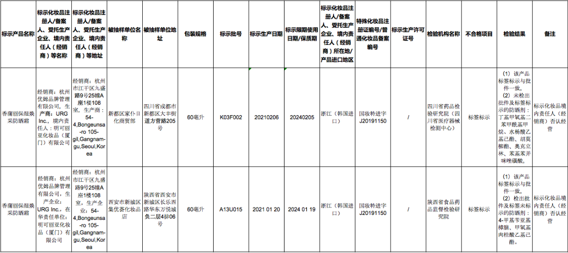 此次抽檢中,共有兩批次由URG Inc.生產(chǎn)、杭州優(yōu)姆品牌管理有限公司(在華責(zé)任單位:明可麗亞化妝品(廈門)有限公司)經(jīng)銷、規(guī)格為60毫升、標(biāo)稱為香蒲麗保濕煥采防曬霜、批準(zhǔn)文號(hào)/備案號(hào)國(guó)妝特進(jìn)字J20191150的防曬霜被檢出標(biāo)簽標(biāo)識(shí)不合格。
