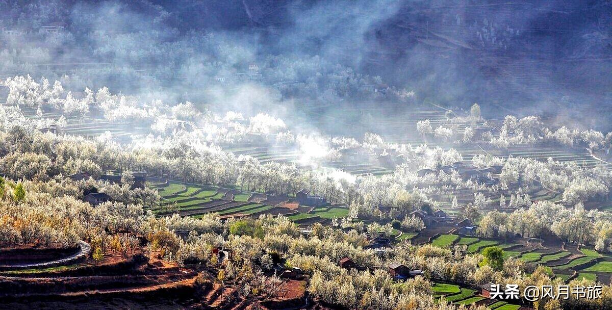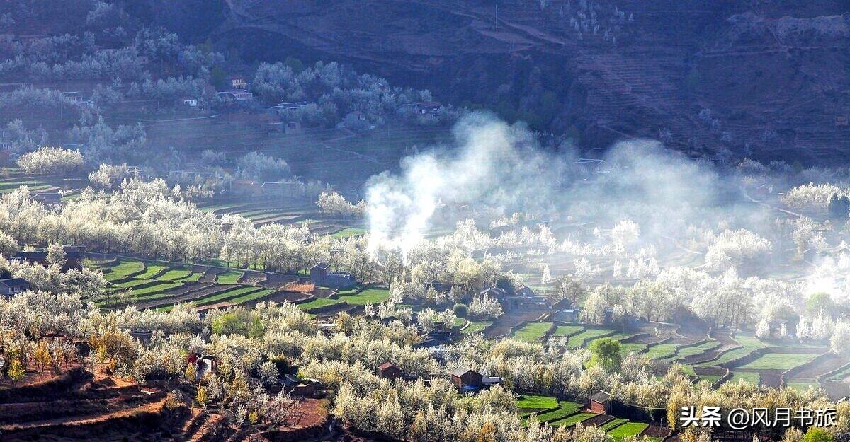 傍晚日落前后,可以拍攝夕陽照耀下火紅的天空,炊煙裊裊的民居,以及萬畝潔白的梨花,形成冷暖色彩對(duì)比的光影照片。