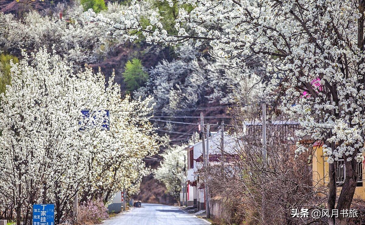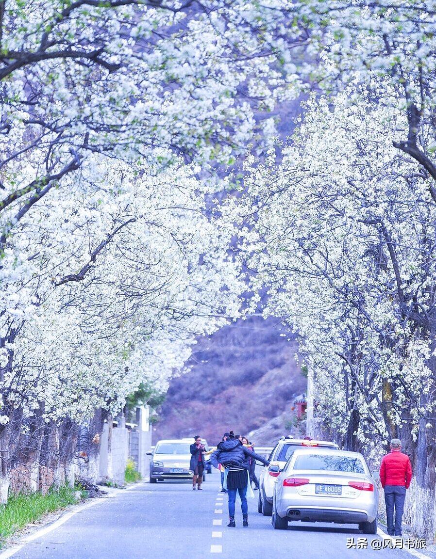 道路兩旁,樹身高大的梨樹,花朵開得茂盛,花瓣如絲絨般柔和,自然搭成一個(gè)天然屏障,過往的車輛和樹下的行人,穿行其間,粉妝玉砌,如入仙境!