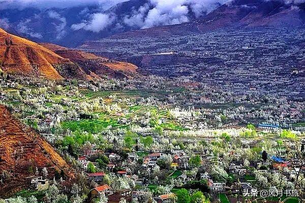 其一,山頂?shù)难┗ㄅc河谷的梨花競相爭艷。山頂是白雪的世界,落日將云彩燒得一片火紅。河谷,則是梨花的世界。白雪、梨花、晚霞,組成一幅天然圖畫!