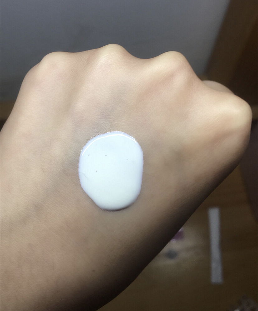 透白色的質地,水水的很輕薄,超好抹開,瞬間成膜不油膩,完全不會泛白,很喜歡!
