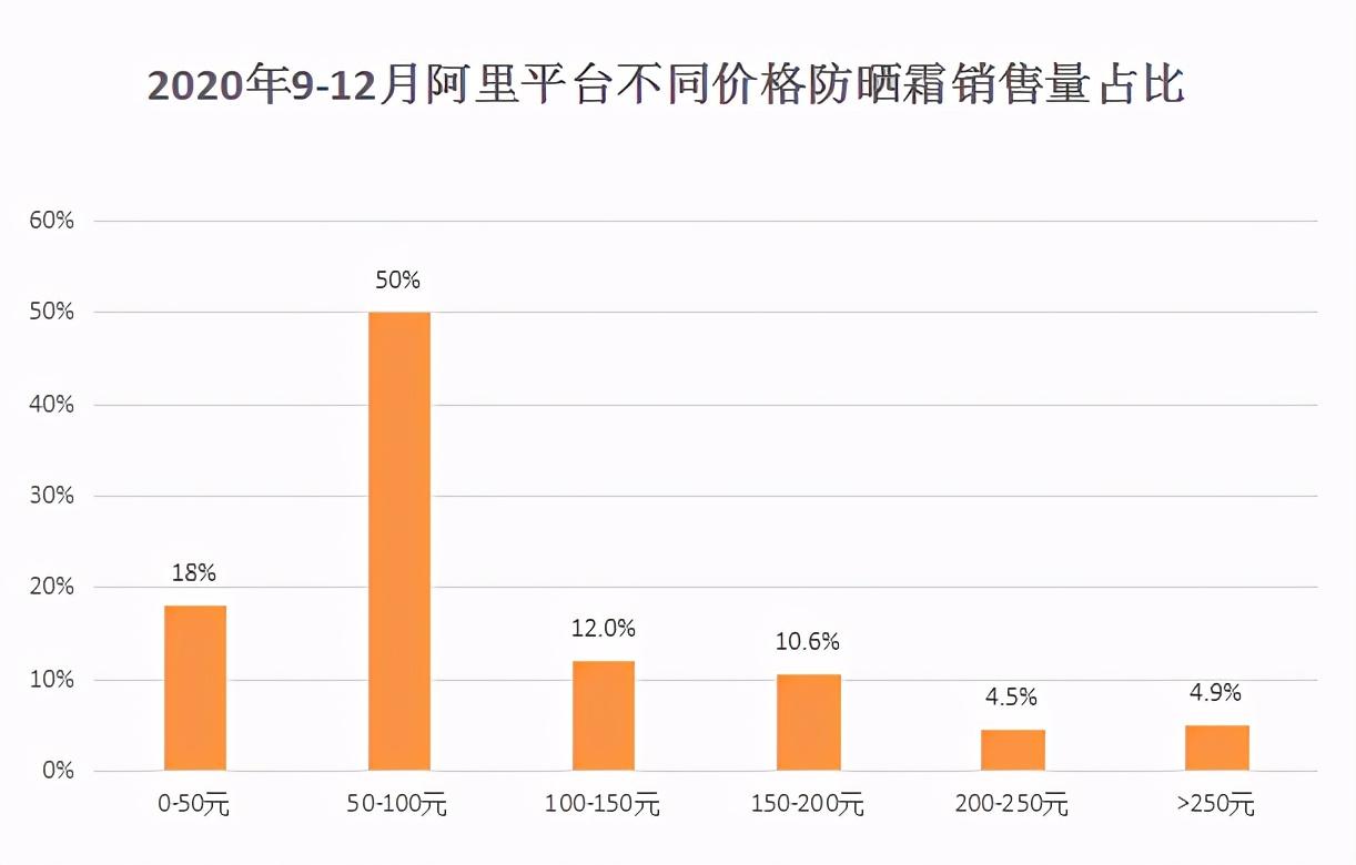 在2020年9—12月阿里平臺防曬霜銷售量圖中,定價為50—100元的防曬霜銷量高,占比50%,其次是定價為0—50元的防曬霜,銷量占比18%。