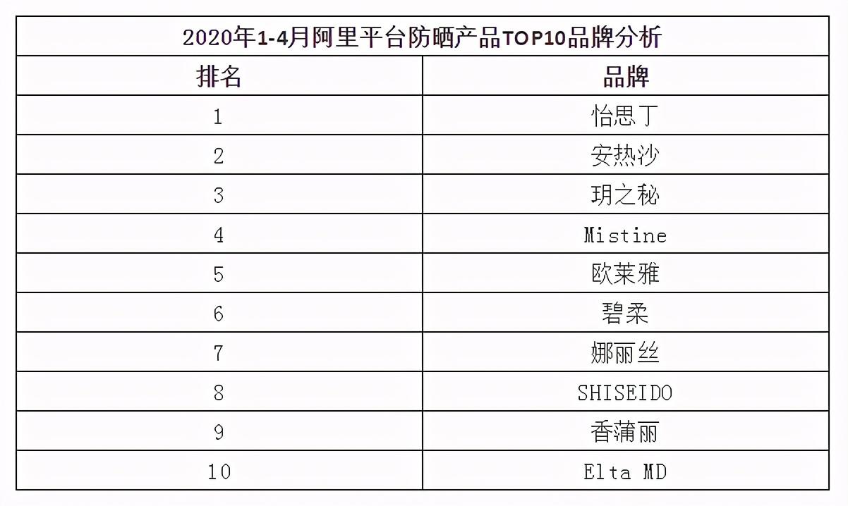 2020年1-4月阿里平臺防曬產(chǎn)品TOP10品牌分析