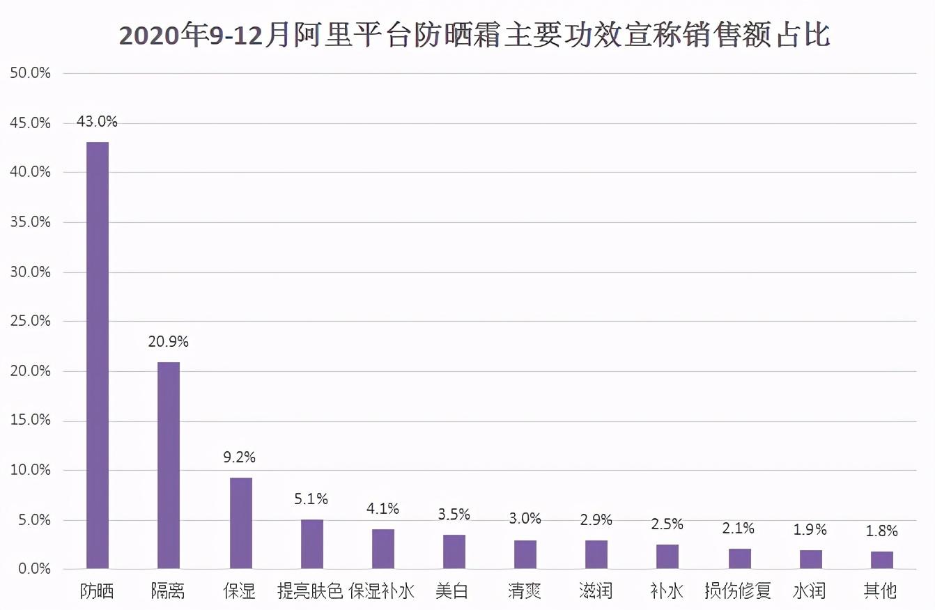 目前,市面上的防曬霜功主要以防曬和隔離為主,這兩種功的防曬霜銷售額占比為63.9%,排在第三名的功是保濕,占比9.2%。