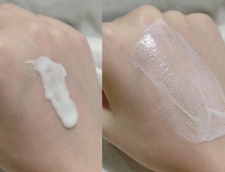 乳液般質(zhì)地,流動力中等比較容易涂均勻,上臉滋潤度中等,膚感較為清爽,成膜速度快。成膜后在皮膚表面不泛白,后續(xù)疊加化妝品不易搓泥。