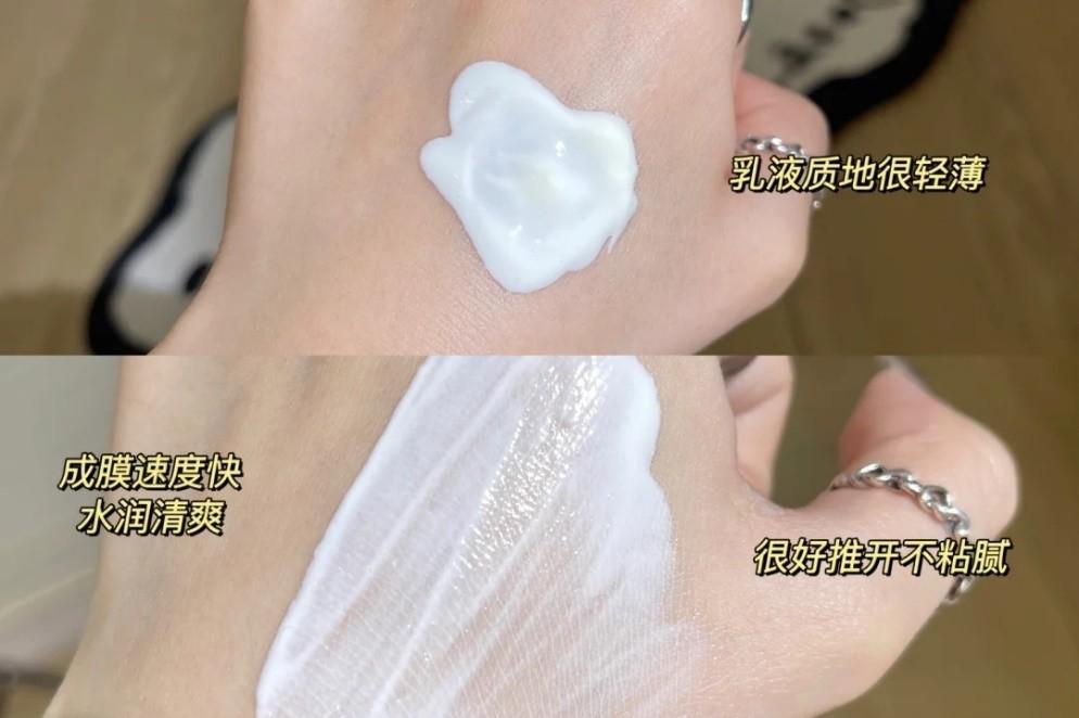 這款防曬采用水包油技術(shù),質(zhì)地相對輕薄,上臉使用感清爽不粘膩,成膜后不泛白,后續(xù)疊加化妝品基本不會搓泥。