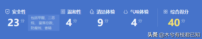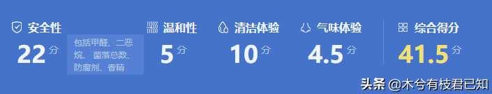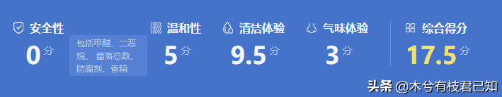 妙思樂在甲醛、二噁烷、防腐劑、菌落總數(shù)4項專業(yè)性評測中,檢出少量甲醛,但含量在國標(biāo)要求范圍內(nèi)。在體驗式評測中,pH值稍低,更適合大齡寶寶使用;清潔效果較弱,但是用后肌膚滋潤不干燥;香味自然不刺鼻。