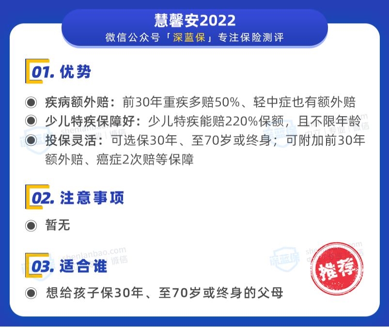 新增:青云衛(wèi)2號、小淘氣1號減少:大黃蜂7號(全能版)原因:「青云衛(wèi)2號」重新上線;「小淘氣1號」保終身時性價比很不錯,可附加前30年額外賠,價格比「大黃蜂7號(全能版)」便宜慧馨安2022我們前面講過,這款產(chǎn)品保至70歲或終身,性價比依然很高。如果要買這款產(chǎn)品,建議大家把“前30年額外賠”給加上,這樣重疾、輕中癥都有額外賠。