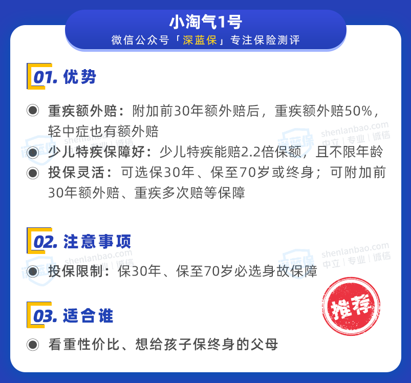小淘氣1號能附加“前30年額外賠”,附加后重疾能額外賠60%,輕中癥也有額外賠,價格不貴,建議大家選上。
