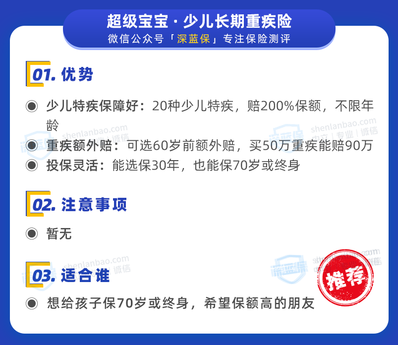 這款產(chǎn)品基礎(chǔ)保障都很,價格也很便宜,0歲男寶,買50萬保額保30年,分20年交每年只需要618元,適合追求性價比的家長們選擇。